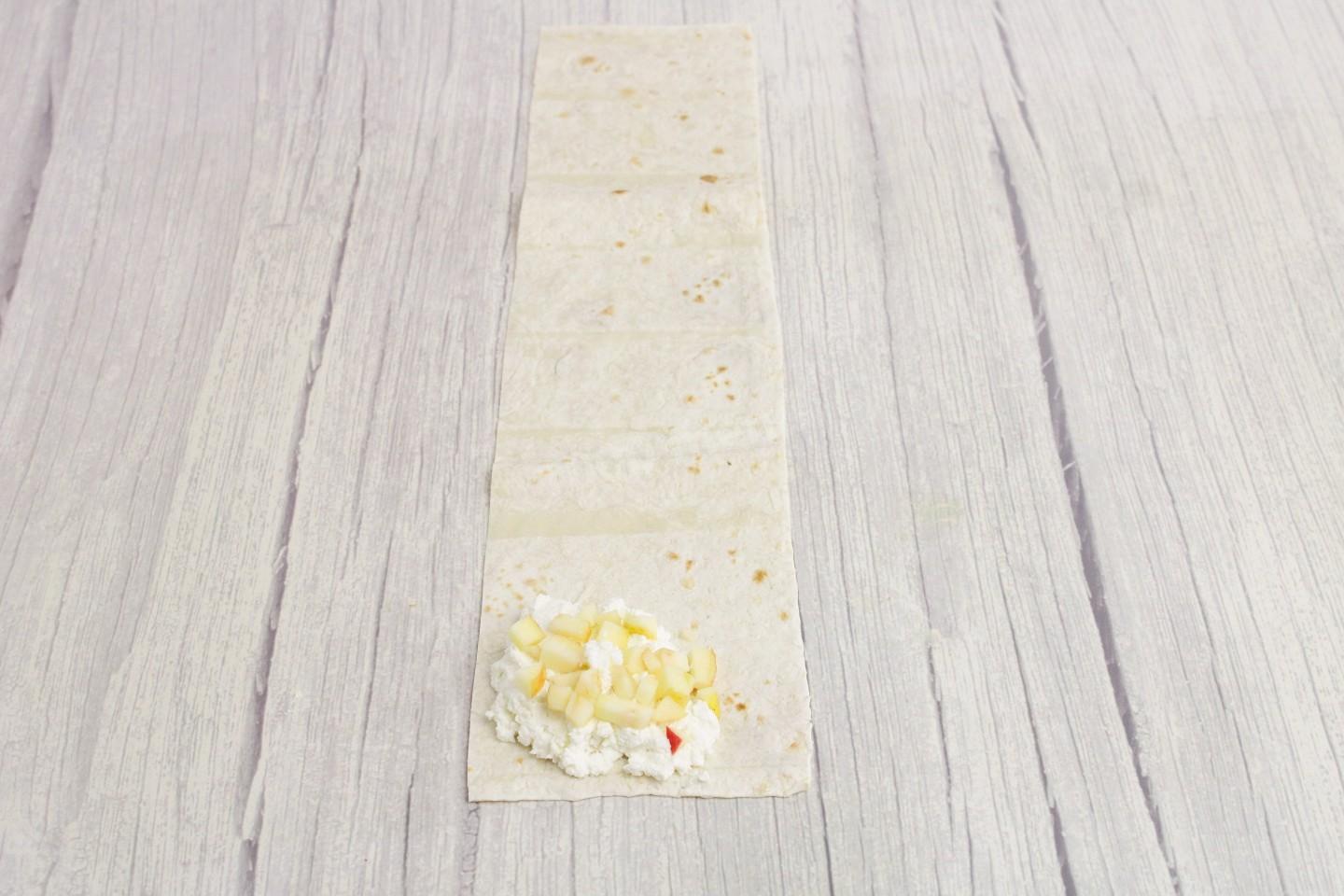 Лист лаваша разрежьте вдоль на 3 полоски одинаковой ширины. У меня армянский лаваш размером 30*36 см. Ближе к краю полоски лаваша выложите начинку из творога. Сверху на творог распределите нарезанные яблоки. Можно творог сразу перемешать с яблоками. Выбирайте вариант, который вам больше нравится.