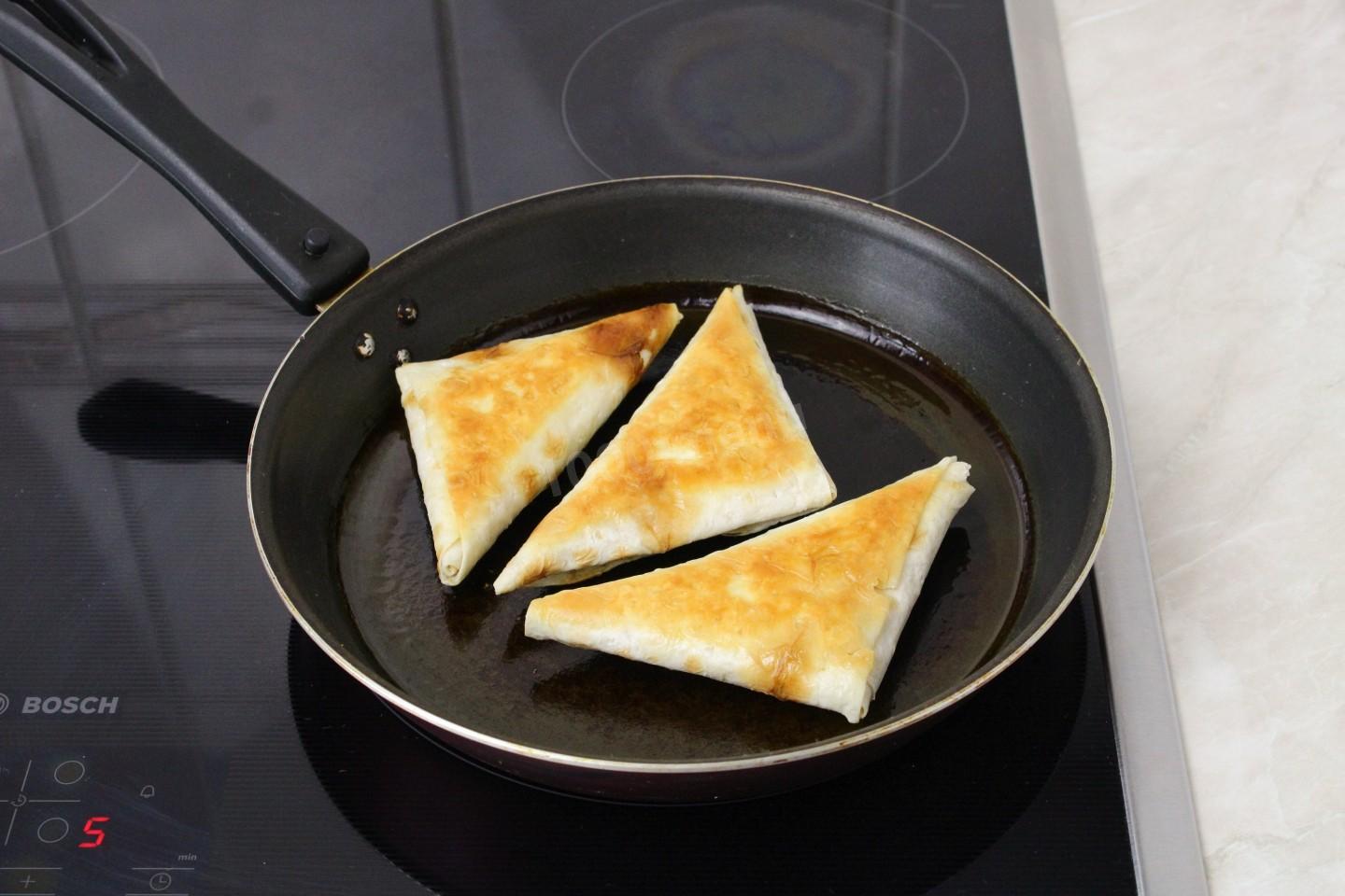 На сковороде разогрейте растительное масло. Выбрать сковороду, масло и определиться с температурой обжаривания помогут статьи после рецепта. Ссылки под шагами. Сколько по времени жарить треугольники на сковороде? На среднем огне обжарьте треугольники из лаваша до румяности ориентировочно по 2 минуты с каждой стороны. Время приготовления будет зависеть от особенностей работы вашей плиты.
