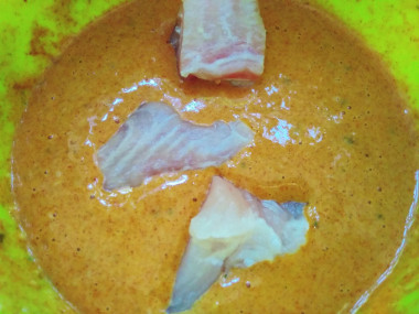 Каждый кусочек рыбы окуните в кляр, чтобы он равномерно покрыл рыбу со всех сторон.