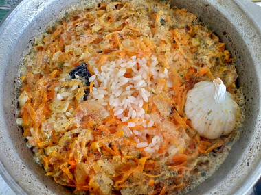 За 5 минут до готовности воткните в почти готовый плов целую головку чеснока. Затем выключите огонь и дайте плову настояться в течение 10-15 минут под крышкой.