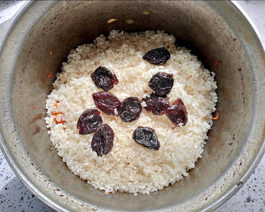 Всыпьте промытый рис и чернослив. Все тщательно перемешайте с морковью.