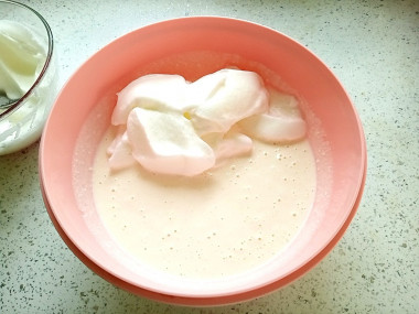 Начните добавлять взбитые белки в творожную массу порциями. Каждую порцию аккуратно вмешивайте ручным венчиком, "закапывающими" движениями снизу вверх.
