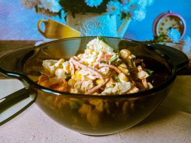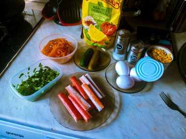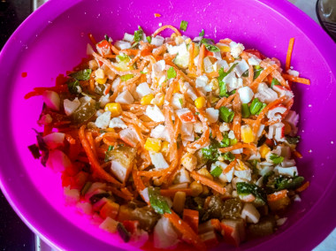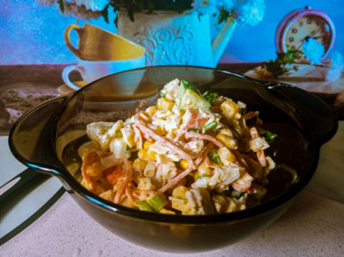 Увидел рецепт и решил сделать этот салатик на скорую руку. Делал все по рецепту за небольшим исключением. Огурец обнаружился только один, поэтому дрьавил еще один соленый. Нарезал все кубиками. Морковку тоже немного измельчил, чтобы не была слишком длинной. Кукурузы хватило половины банки. Из зелени кроме лука добавил немного петрушки и кинзы. Все перемешал, заправил мазиком и убрал в холодильник на полчаса. Салатик получился замечательный. Главное что все просто и быстро. Думаю что можно попробывать добавить еще и немного горошка. Спасибо автору за рецепт, всем рекомендую)