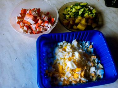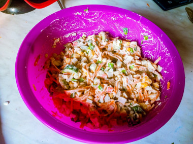 Вон наш салат с крабовыми палочками «Палочка-выручалочка» и готов. Можно подавать к столу. Приятного аппетита)