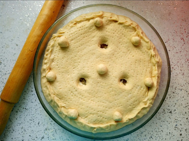 Меньшую часть теста также раскайте. В центре раскатанного теста сделайте отверстие для выхода пара. Закройте начинку тестом. Края нижнего пласта теста приподнимите и соедините с верхним. Хорошо защипните края удобным способом.