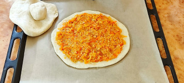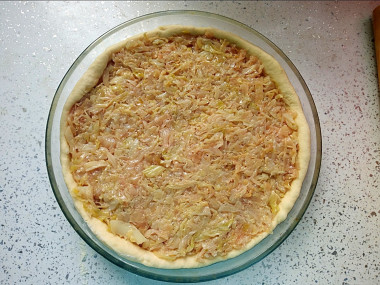 Выложите на тесто капустную начинку, оставляя от краев расстояние 1-1,5 см.