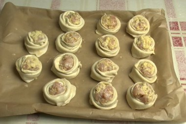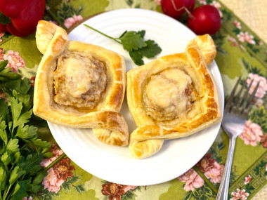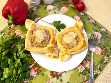 На это блюдо у меня ушло: один килограмм теста и пол килограмма фарша, получилось всего 16 лодочек, слойки получились пышными, бортики хорошо поднялись, начинка сочная, ароматная, а тягучий сыр делает блюдо еще вкуснее, мужчинам моим очень понравились. Буду готовить еще, но в следующий раз возьму, как в рецепте, мелко нарезанное филе с майонезом, все таки фарш был очень сочным и из-за бульона тесто немного промокло и осело при остывании.