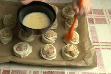 Взболтайте в мисочке одно яйцо. С помощью кулинарной кисточки смажьте пирожки со всех сторон в том числе и начинку. Благодаря яйцу выпечка приобретет глянцевость и золотистую корочку.