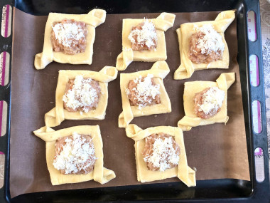 Начинила их фаршем, сверху посыпала моцареллой, запекала на 160 минут радусах 35 минут, выбрала такой режим, потому что это идеальная температура для выпекания слоенного теста.