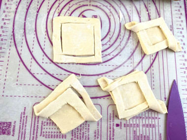 Тесто взяла слоеное дрожжевое, 1 кг, из него решила сделать лодочки, после разморозки разрезала его поперек на четыре широкие полоски, а эти полоски на четыре равных квадрата, сделала надрезы в квадратах по углам, в двух противоположных углах не дорезая до конца, и перекинула эти части теста крест-накрест, получились такие лодочки.