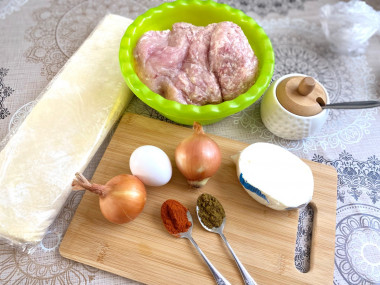 Как сделать слойки с курицей из слоеного теста? Подготовьте все перечисленные в списке ингредиенты. Слоеное тесто заранее достаньте из морозильной камеры и разморозьте согласно инструкции.