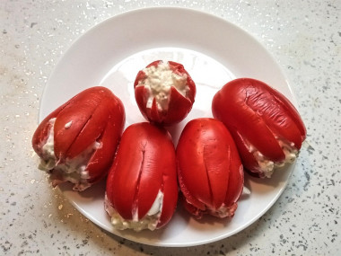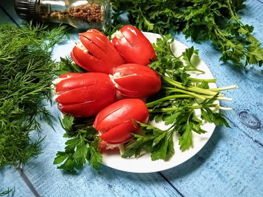 Салат тюльпаны из помидоров с плавленным сыром мне знаком, когда-то я его делала, только с другой начинкой. Захотелось приготовить на ужин небольшой "букетик". Помидоры у меня были не очень сочные, семян с соком вынула немного. Поэтому и количество начинки сократила в два раза. Все что не поместилось съел сын в виде салата) В начинку кроме яиц, крабовых палочек и плавленного сыра добавила свежие огурцы. Мне кажется они хорошо сочетаются со всеми ингредиентами. Плавленный сыр перед натиранием слегка подморозила, чтобы легче натирался. Заправила майонезом с добавлением чеснока и чёрного перца. Помидорки надрезала на 8 лепестков, так начинка лучше укладывалась. Для декора использовала зелёный лук и петрушку. "Тюльпаны" получились не только вкусными, но и очень сытными. Эту закуску хорошо подавать на большом овальном блюде к праздничному столу, смотрится эффектно.