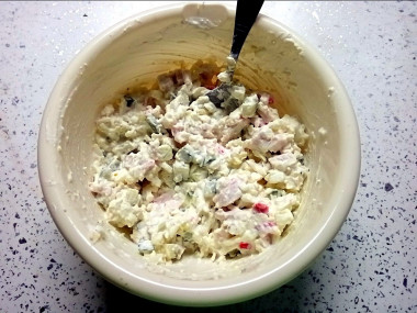 Заправим майонезом и приправим по вкусу. Хорошо перемешаем.