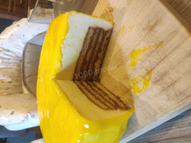 Начиная с центра, залить торт глазурью. Сначала половиной и подождать, пока первый слой чуть не усядется.