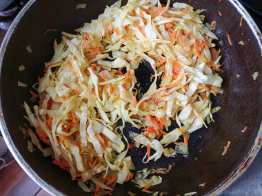 Затем добавьте нашинкованную капусту. Тушите все под крышкой минут 20, до мягкости капусты. По вкусу добавьте немного соли и специи. Чтобы капуста не подгорала, можно добавить немного воды. Готовую начинку остудите.
