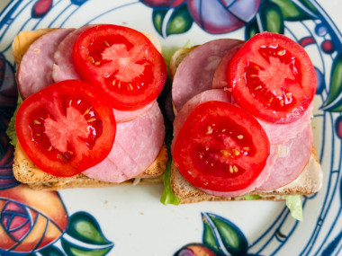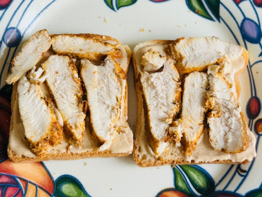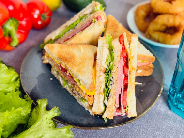 Куриную грудку приготовила с вечера. Взяла одну грудку, разрезала на 3 части, натерла специями для мяса. Обжарила на среднем огне по 5 минут с каждой стороны до корочки, добавила столовую ложку воды и оставила в выключенной сковороде под крышкой. В таком состоянии, в остывающей сковороде за 30 минут она дошла до полной готовности, но осталась сочной. На ночь - в холодильник. В соус из майонеза и горчицы добавила еще немного соуса барбекю. Хлеб сушила в тостере. Из колбасы взяла ветчину. После сбора сендвича медленно и сильно нажала на него, чтобы спрессовался и не развалился. После разрезания, скрепила зубочисткой. Сэндвич получился сочным, хрустящим, ярким. Салат и томат дают хруст и сочность. Мясо - сытость, а соус объединяет весь тандем ингредиентов.