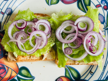 А в это время подготовьте все остальные ингредиенты. В глубокой небольшой ёмкости смешайте горчицу и майонез. Луковицу очистите. Помидор, лук и айсберг помойте, а затем обсушите. Вместо айсберга можно взять листочки романо, шпината, латук или фриссе.