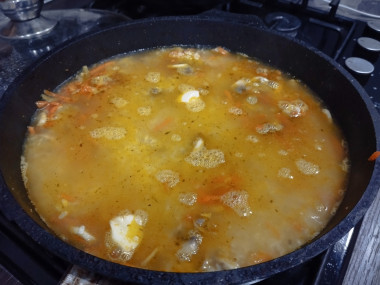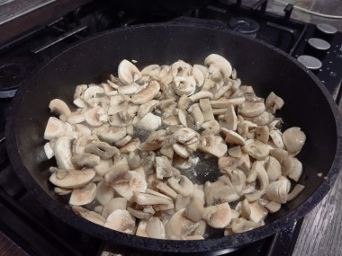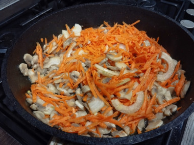 Сначала обжарила шампиньоны, порезанные пластинками, добавила лук с морковью,немного вместе обжарила.