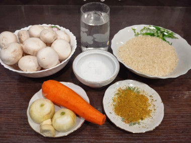 Калорийность продуктов: Шампиньоны, Рис, Лук, Морковь, Чеснок, Вода, Растительное масло, Соль, Специи сухие