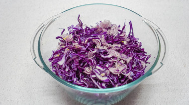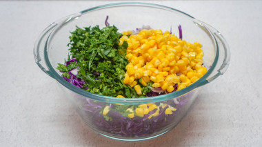 На гарнир к запеченной свинине я решила приготовить легкий овощной салат. Мой выбор пал на салат из краснокочанной капусты с кукурузой. Подготовила ингредиенты по списку, нарезала соломкой краснокочанную капусту. Вместо репчатого лука использовала красный салатный лук. В миске смешала нарезанную капусту, красный лук полукольцами, рубленную свежую зелень (петрушка, укроп) и консервированную кукурузу. Салат заправила растительным маслом, лимонным соком и добавила соль по вкусу. Хрен добавлять в салат не стала, так как не особый любитель хрена.