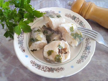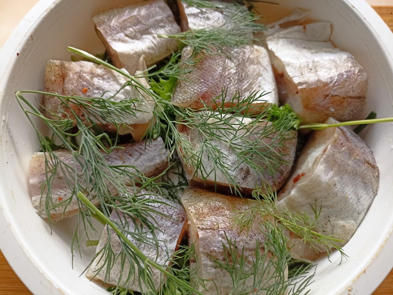Решила сделать на ужин диетическое блюдо из рыбы. Понравился рецепт минтай на пару в мультиварке. Для приготовления выбрала молочного хека. Почистила рыбку, порезала на порционные кусочки. Из специй добавила лишь соль. В ёмкость для приготовления на пару выложила свежие веточки петрушки, а сверху рыбку. Готовила в мультиварке в режиме "на пару" 15 минут.