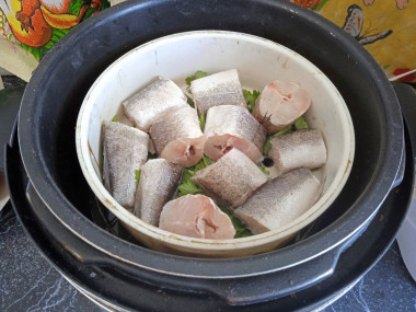 В чашу мультиварки налейте необходимое количество горячей воды, установите ёмкость с рыбой. Готовьте в режиме "варка на пару" 20-25 минут. Время указано приблизительно, так как оно будет зависеть от мощности и особенности работы вашей мультиварки. Подробнее об этом читайте в отдельной статье по ссылке в конце рецепта.