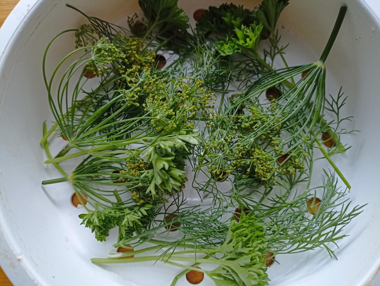 В чашу для варки на пару выложите зелень петрушки и соцветия укропа.