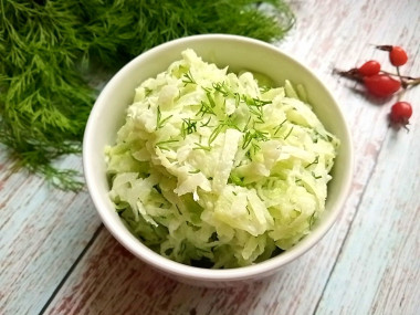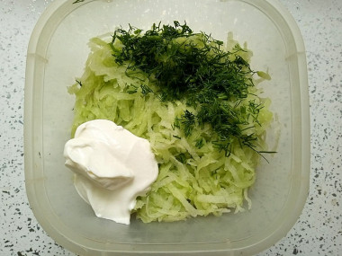 Редька у меня белая, она наименее остая. Кожицу счистила овощечисткой, это удобно и быстро. Сами корнеплоды натерла на крупной тёрке. Редька очень сочная, поэтому часть сока слила. Добавила соль и от себя намного свежего укропа. Заправила салат густой сметаной.