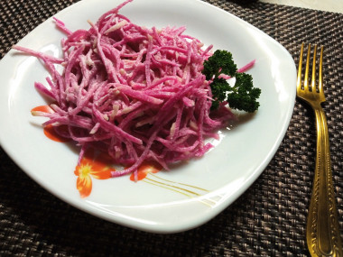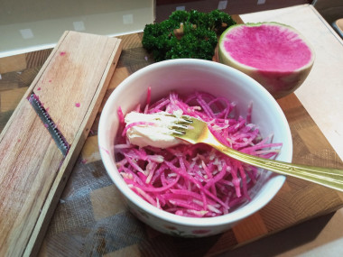 Салат из сочной, разноцветной редьки со сметаной, такой яркий и красочный, что даже жалко было его есть.