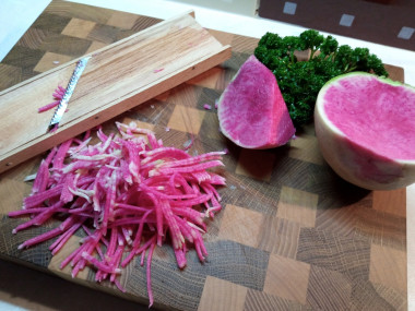 Попалась на рынке на глаза интересная редька - арбузная, на вкус она нежнее и слаще белой и нет такого выраженного запаха, что для меня определенно плюс