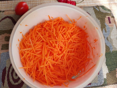 Морковь вымоем, очистим и сполоснем. Натрем ее на терке для корейской моркови и положим в миску. Если такой терке нет, то можно просто порезать тонкой соломкой. Для этого ножом для чистки овощей сделаем из моркови тонкие слайсы, а затем порезать тонкой соломкой.