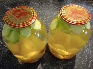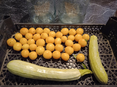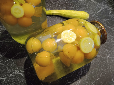 Очень оригинальный рецепт. Давно когда-то слышала, что по вкусу должен получиться ананасовый компот. Решила приготовить компот из алычи и кабачков на зиму по этому рецепту. Сделала для пробы две трёх литровые банки. Очень просто готовить. Жёлтую алычу сложила в стерильные банки. Кабачки молодые порезала кружками и тоже положила в банки. Мяту не клала, она у меня закончилась, к сожалению. Для аромата добавила в каждую банку по одной гвоздичке. Залила кипятком, дала постоять минут 20. Слила воду, положила сахар и закипятила. Залила сироп в банки и закатала.
