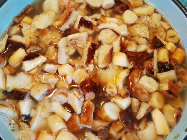 Выложите грибы в кипящий маринад и варите на среднем огне около 15-20 минут. В конце варки влейте уксус. Его количество можете уменьшить на ваш вкус, но помните, что уксус создаёт кислую среду, тем самым останавливает развитие бактерий и предотвращает порчу продукта.