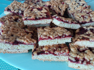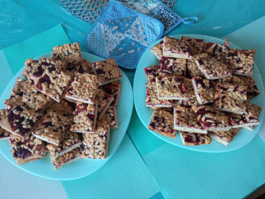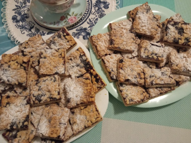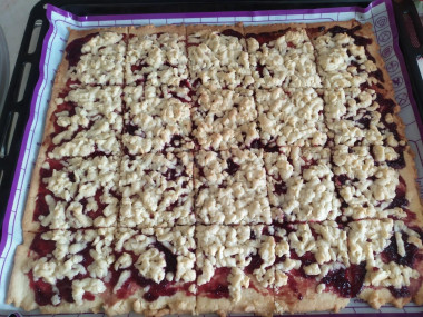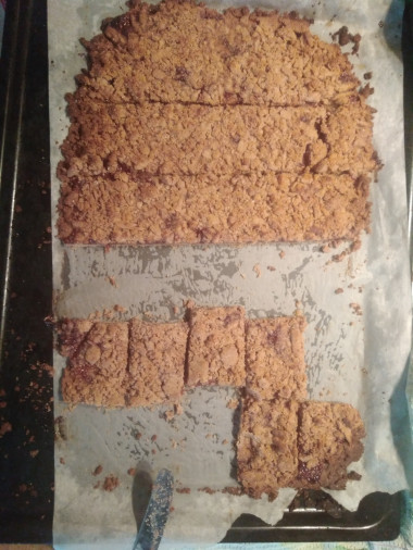 Готовый пирог выньте из духовки. Я сразу его разрезала на квадраты песочного печенья с крошкой, пока был горячим. Приятного аппетита!
