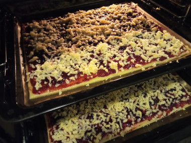 Выложите тертое тесто поверх варенья. Поставьте противень в разогретую до 180 градусов духовку на 25 минут. Ориентируйтесь на особенности своей духовки - времени у вас может уйти больше или меньше, чем у меня.