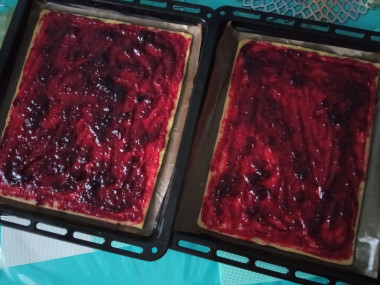 Размажьте по тесту варенье. У меня это черная смородина. Оно очень хорошо сочетается с таким тестом. Можете взять сливовое, абрикосовое, без косточек. Если варенье у вас жидковато, можете предварительно смешать его с манкой, мукой или проварить с крахмалом. Я этого не делала.