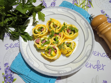 Приготовила на завтрак рулет с сыром и зеленью. Использовала свежую зелень петрушки для начинки. Сыр у меня был мраморный. Яйца на белки и желтки не разделяла, а просто взбила. На разогретую сковороду с маслом вылила яйца, посыпала тёртым сыром и готовила под крышкой на медленном огне 5 минут. Горячий яичный блинчик с сыром сняла со сковороды, посыпала зеленью и завернула. Потом решила ещё добавила в начинку немного колбаски для сытности, развернула рулет, положила полосочки колбаски и снова завернула. Полежал рулет пару минут и я его разрезала на небольшие кусочки. Рулетики получились очень красивыми, аппетитными и вкусными. Отличный рецепт! Завтрак сытный и яркий. Большое спасибо автору 😊