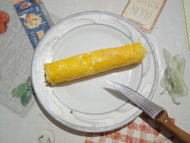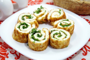 И еще такой рулет из яичных блинчиков с начинкой из плавленого сыра с крабовыми палочками.