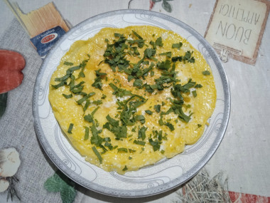 Готовый омлет выложить на блюдо.Посыпать мелко нашинкованной зеленью.))