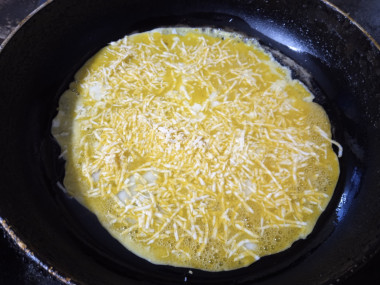 Добавить тёртый сыр и немного посолить(1 щепотка соли)И аккуратно перемешать)