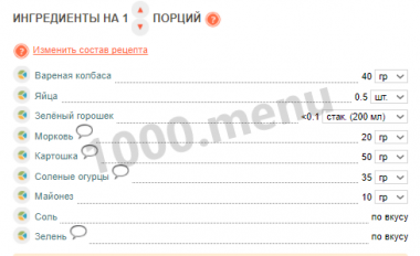 Только вот у меня вопрос. Мне нужно приговотовить скажем купить все для оливье на 35 человек. Этот сайт говорит о 2 кг колбасы, другой сайт говорит про 1 кг. Подскажите, что делать??Количество порций в рецепте указывает автор этого самого рецепта. Порции для всех бывают разными, это дело сугубо индивидуальное. Кому-то хватает 100 граммов салата, а кому-то и 250 будет мало.