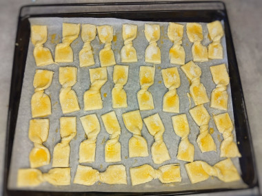 4. Сформируйте из прямоугольников бантики: делается это с помощью перекручивания прямоугольника по середине. Можно проткнуть бантики в нескольких местах ножом - тогда тесто не вздуется при выпечке.