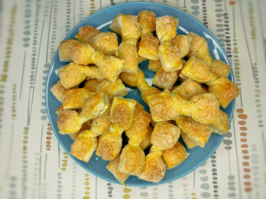 Слоеные бантики с сахаром впечатлили простотой приготовления и отличным вкусом. Рецепт настолько легкий, что с ним справится даже ребенок. Всего из трех ингредиентов получается целая тарелка аппетитных слоечек к чаю. Они исчезают мгновенно, как семечки.