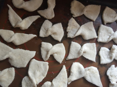 6. Противень застелите пекарской бумагой, разложите на ней будущие бантики.