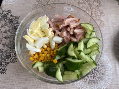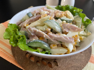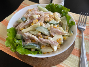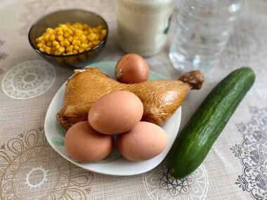 Захотелось в выходной чего-нибудь вкусненького, но все салаты уже надоели, и тут нашла такой простой в приготовлении и обещающий быть очень вкусным салат с копченой курицей и кукурузой.