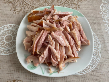 Копченый куриный окорочок очистите от шкурки. Затем отделите мясо от костей. Само мясо немного нарежьте и переложите в подготовленную чашу для приготовления салата.
