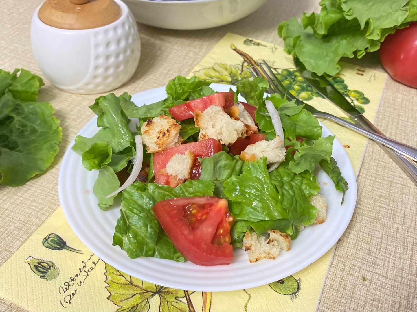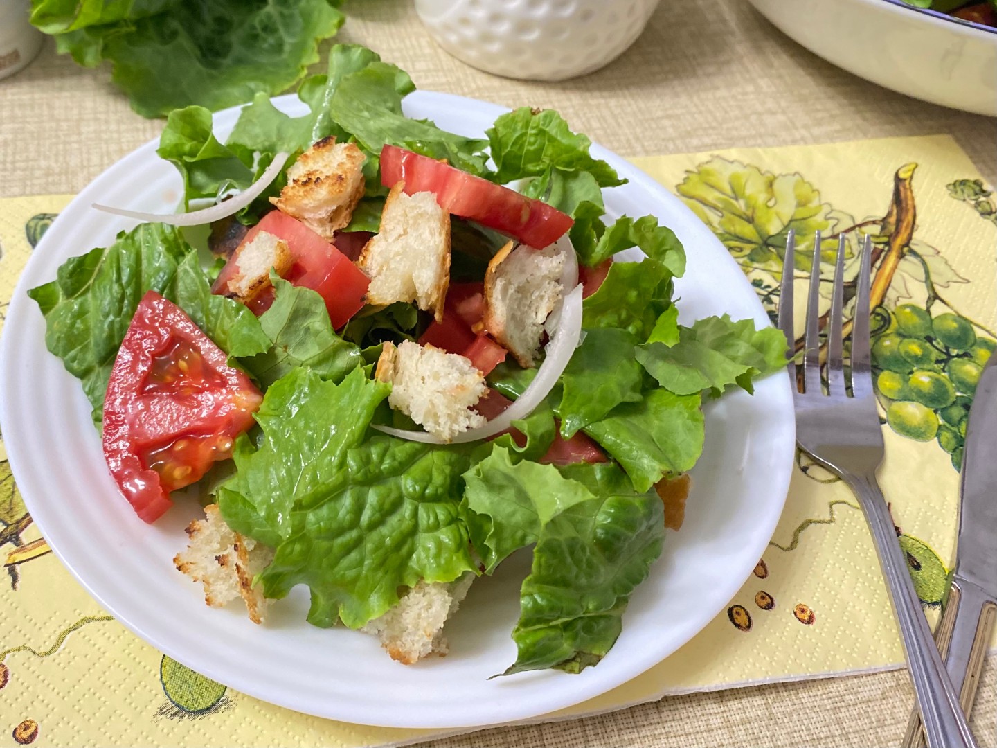 Как сделать салат панцанелла? Подготовьте продукты. Помидоры выбирайте спелые, мясистые, вкусные. Лук можете взять как обычный репчатый, так и фиолетовый или белый салатный. Хлеб подойдет любой — багет, тостовый, обычный батон. Салат берите любой, также, как и зелень. Масло подойдет любое растительное, уксус — винный красный, белый или яблочный. Можете заменить уксус лимонным соком.