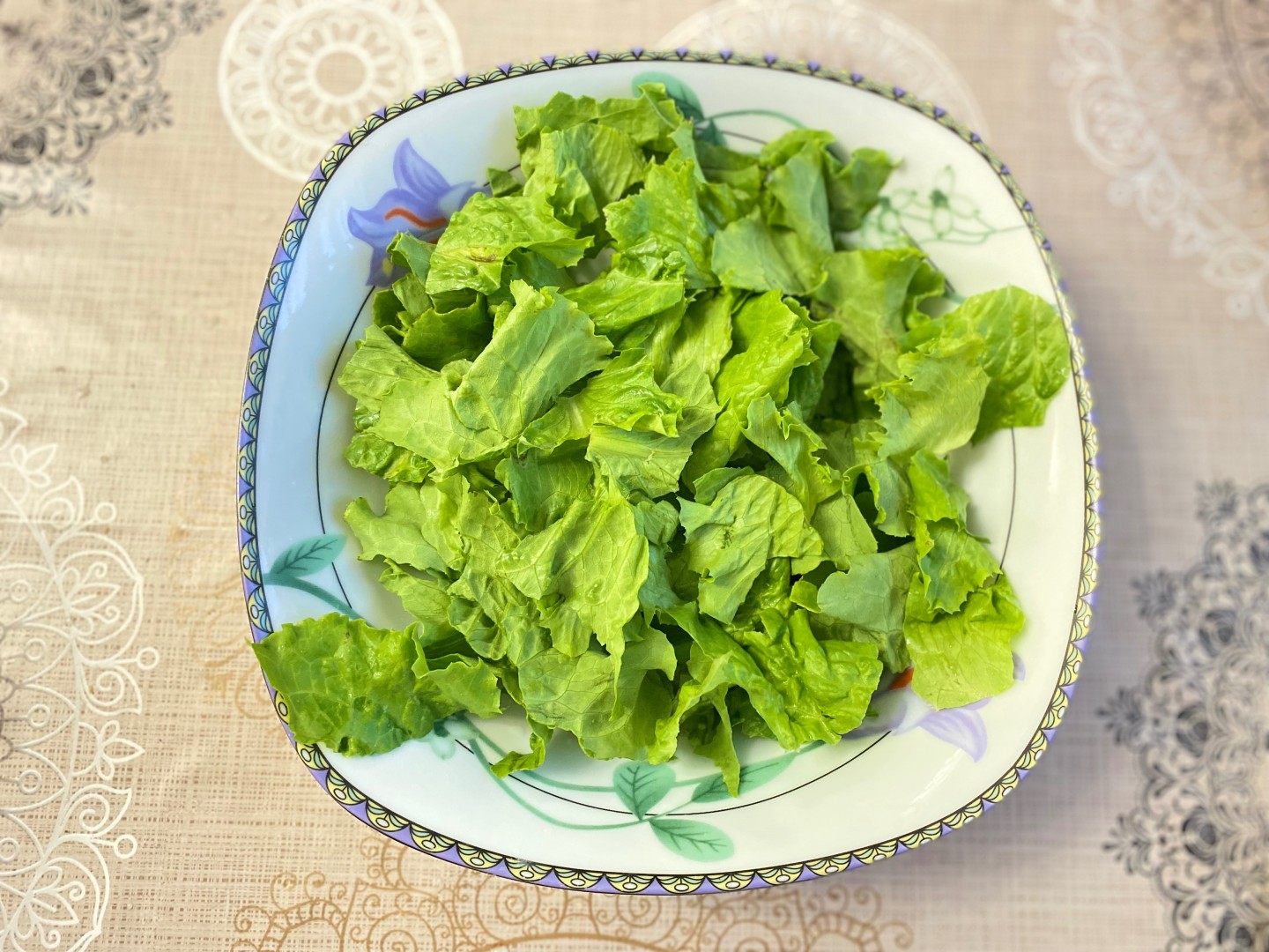 Возьмите глубокую широкую тарелку и руками порвите в нее салатные листья. Их и зелень предварительно промойте и обсушите от влаги. Добавьте к салату помидоры и лук. Базилик порвите также руками — так он будет ароматнее.