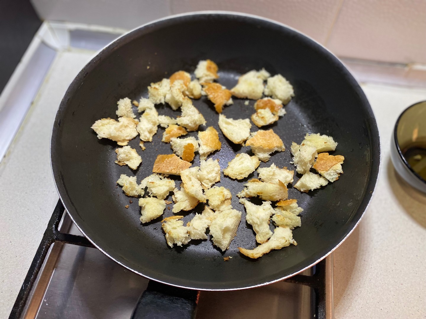 Сразу поставьте сушиться сухари. Для салата панцанелла хлеб не режется, а крупно рвется руками. Готовить сухари можно на сковороде или в духовке, как вам больше удобно. Сушите их, помешивая, до хрустящего состояния и румяной корочки.