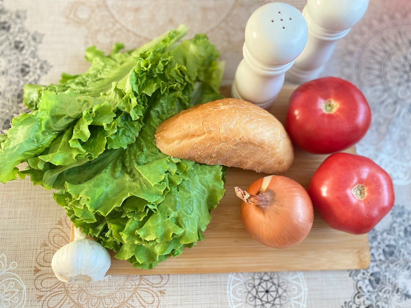 Готовится очень быстро и просто, взяла свежие овощи и зелень, свежих хлеб поломала на маленькие кусочки.